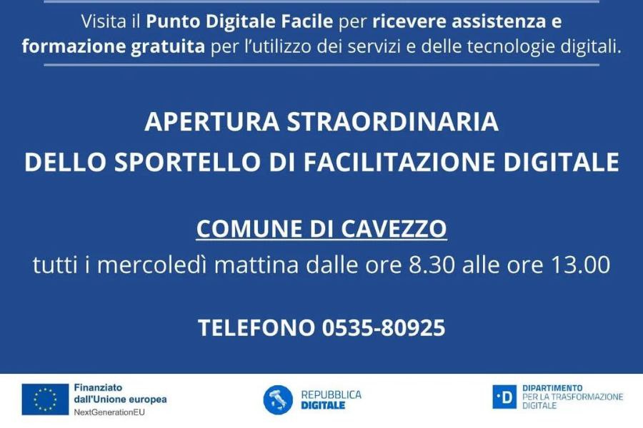 Il Punto di Facilitazione Digitale di Cavezzo si aggiunge a quelli già presenti nei comuni di Camposanto, Concordia, Finale Emilia, Medolla, Mirandola, San Felice e San Prospero, con sportelli operativi in diverse giornate e orari. Per maggiori informazioni, è possibile rivolgersi direttamente al Comune di Cavezzo.
